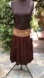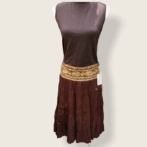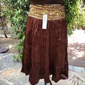From Caché, a crinkled texture brown boho-style midi skirt with a wide gold sequin bead embroidered waist.
