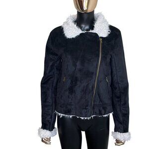 CAGE Black Faux Suede Sherpa Moto Jacket Women's Size M Asymmetrical Zip