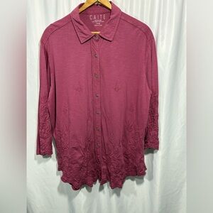Elegant burgundy blouse with button-up design. Features subtle floral embroidery.