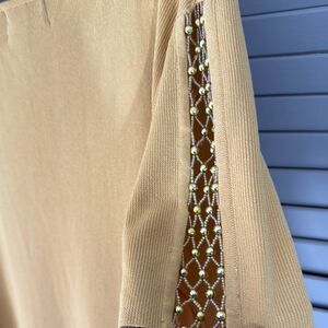 Stylish gold top with chain embellishments. Features a unique neckline design. Perfect for a chic look.