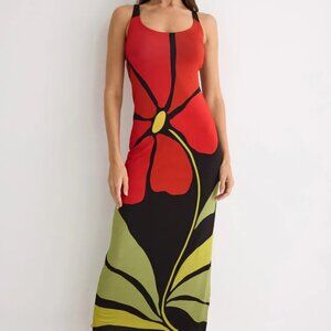 The Solange Dress by Cala de la Cruz features a vibrant, multicolored floral pattern and a comfortable design. Pair it with neutral sandals and minimalistic jewelry for a relaxed daytime look.