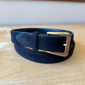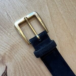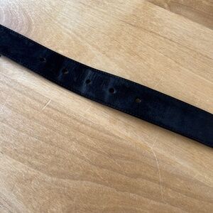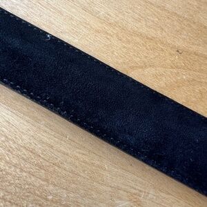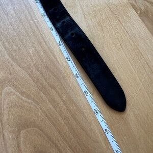 No size but tightest notch measures 32”. Black suede with solid brass buckle. See pics - buckle is pitted.