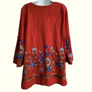 CALESSA Red Cotton Tunic Top Plus Size 1X Boho Embroidered Floral V-neck Summer