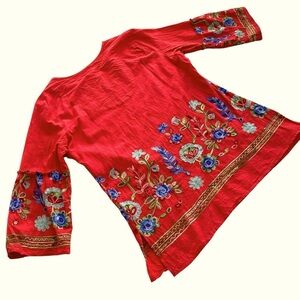 CALESSA Red Cotton Tunic Top Size 1X Boho Embroidered Floral