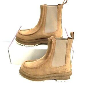 These tan suede Chelsea boots, designed with a platform and lug sole, provide both style and functionality. Their slip-on design ensures ease of wear, while the durable construction ensures longevity. Ideal for adding a sophisticated touch to various outfits.
