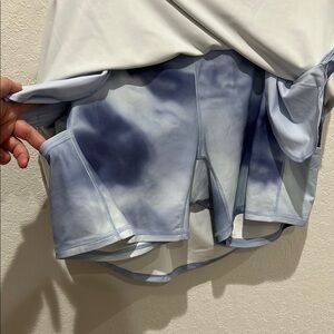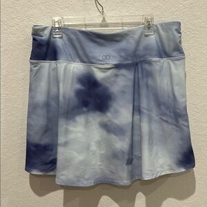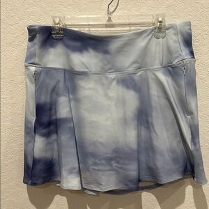 The CALIA mini skirt features a stylish skater design with pleats, perfect for both athletic and casual settings. Its gray and blue hues create a soft, watercolor-like pattern, adding a trendy touch to your outfit. Made from performance fabric, this skirt ensures comfort and freedom of movement.