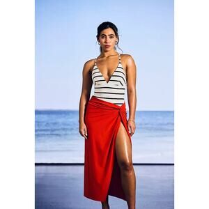 CALIA Swim Triangle Strappy Back One Piece White/Blue Stripe Mesh 16 NWT