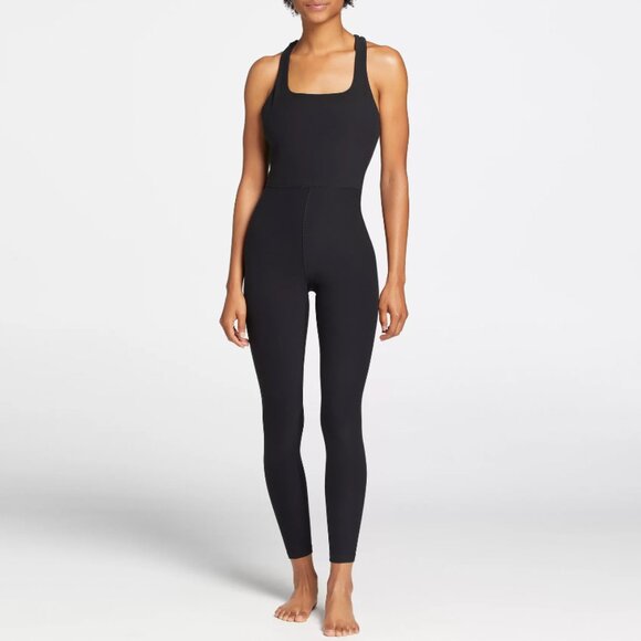 Sleek black jumpsuit. Square neckline. Sleeveless design. Perfect for active wear.