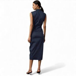This blue sleeveless midi dress by Italian designer Câllas is a stylish and figure-flattering piece. The dress features a classic collar and a cinching detail, adding a touch of sophistication to the look.