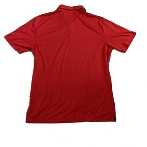 Lightweight, breathable golf polo from Callaway. Solid red in color. Size Large with measurements shown. Features 3 button collar and Callaway logo on chest.