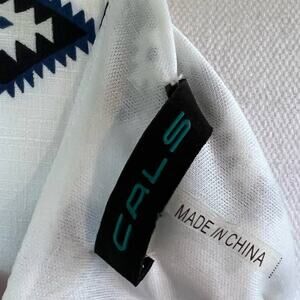 CALS mini dress. Black & blue Graphic pattern on white. Dress has a open puff sleeve at the top. Gold chain belt woven with black leather. Sexy simplicity. Day to night. Professional. Sexy workwear, day night, contemporary, maximalist, ladies who lunch, coastal. Size tag is missing Sized Based on US charts for measurements in inches.