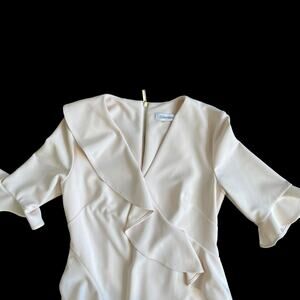 Cascading ruffles wrap the front of a Calvin Klein sheath dress that conveys lovely sophistication.