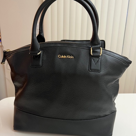 Calvin Klein black leather handbag, with multi compartments, large zippered center compartment, one side with smaller zippered compartment and the other side with two open smaller compartments, 14.5 inch width, 10.5 inch length, goldtone hardware, gently used, from smoke free home