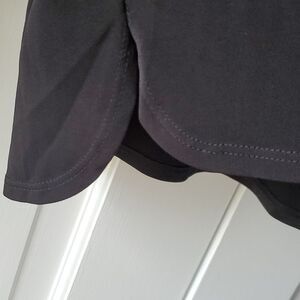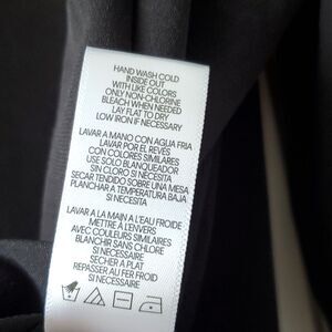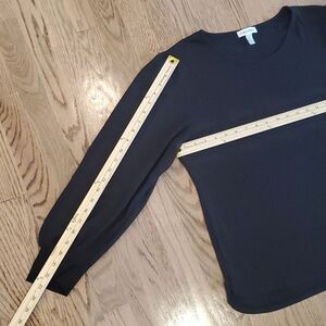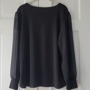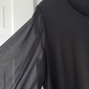 Elegant and simple black contemporary top elevated with sheer puff sleeves and a stretchy knit bodice with side slits. Crew neck. Matching knit around wrists. Flowy and comfortable. Long sleeves. Elevated basic. Pre-owned in excellent, like new condition; only worn once for a wake but now too big.