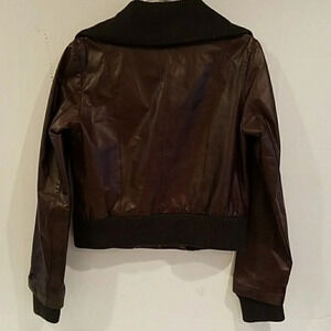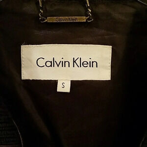 Ladies Calvin Klein brown leather motorcycle style short jacket. The jacket has a zipper closure. There are 2 breast pockets. No side pockets. The jacket is in great condition.