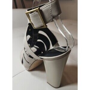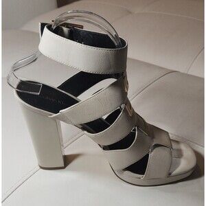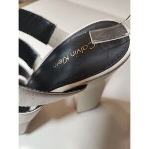 CALVIN KLEIN Benita Leather Platform Sandals Womens White Size 8.5 MSRP $165. Heel measures approximately 4.25". Platform measures approximately 0.75 inches. Metallic hardware detailing.