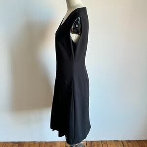 Details: Black sleeveless knee-length dress with asymmetrical seams and asymmetrical pleated skirt; fully lined with back zipper closure.