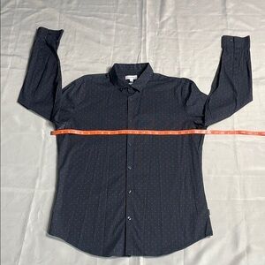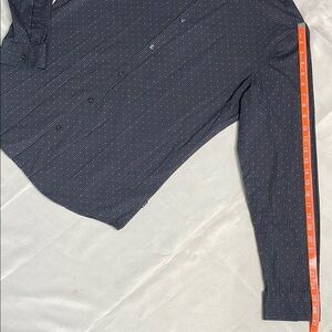 Elevate your style with this sleek black striped shirt. Perfect for any occasion. Has no pockets, has buttons near the collar to fasten the collar, and has deodorant stains.