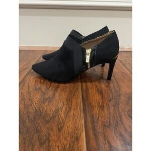 CALVIN KLEIN Black Suede Booties Sz 6.5 Gold Zip Stiletto Heel Fall Winter Chic