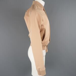 Calvin Klein Collection Spring 2015 bomber jacket comes in a medium tan peachy blush nude beige cotton blend canvas with a pleated baseball collar, cuffs, and waistband, and snap closure. Made in Italy.
