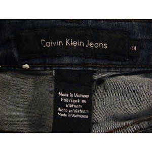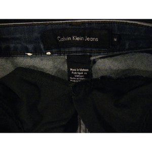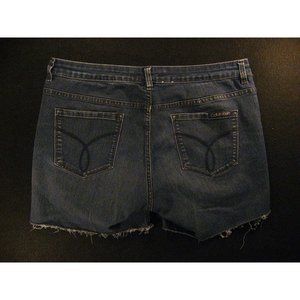 The style of these blue Calvin Klein cut off jean shorts is Classic. They are made of cotton and Polyester. They have a zipper fly. The inside label says Calvin Klein. The size is 34 waist. These shorts would be great for teenagers and women alike. The waist measures 34".