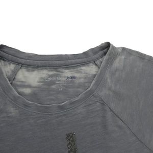 Get your "Rock On"! This tee is perfect distressed in all the right places. Faded around the neck and hem. Sporadic small tears. The CK logo is fashioned out of faux repitilian skin and accented with small metal beads.