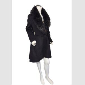 CALVIN KLEIN Faux Fur Collar Black Belted Wrap Wool Blend Coat Women’s size 8. Lined coat, 1 inner pocket. Excellent pre owned condition overall. Back of neck mini button at inner collar has come off but IS INCLUDED in a sealed plastic bag. (the button that the loop on the faux fur collar attaches to). White threads on one cuff are still there from where the logo patch was attached. See all pics