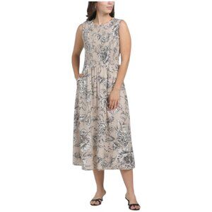 floral print design, smocked waist, pleated accents, 2 side pockets