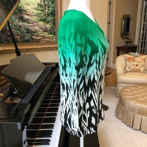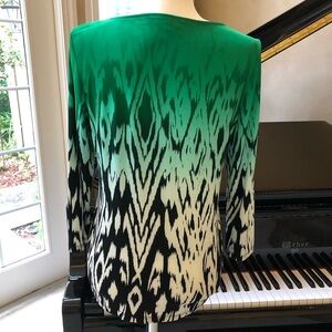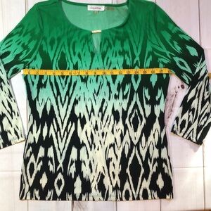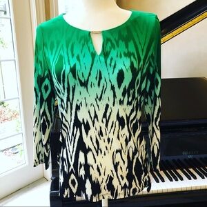 This vibrant Green, Black,and White top with 3/4 sleeves by CALVIN KLEIN is in a contemporary Ombré animal print.