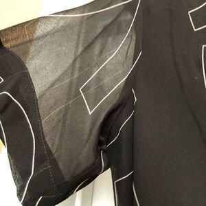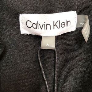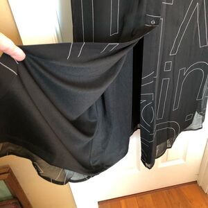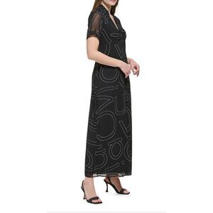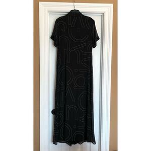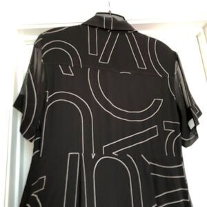 Calvin Klein makes this shortsleeved all-over-logo maxi illusion shirt dress. Black sheer fabric with thin white logo detail throughout. Lined dress with sheer short sleeves. It has an adorable plunge neckline with gathered detail, pointed collar and buttoned front. It’s 50% polyester and 50% reprocessed polyester, so it’s machine washable. Gorgeous maxi length makes it appropriate for any occasion. $85 MSRP. The pit-to-pit measurement is 19”, the length is 56”, the waist measurement is 16.5” and the sleeves are 9”. Such a cute, flattering and carefree dress with a totally put-together look. Perfect with either heels or flats. JUST ADORABLE & NWT!