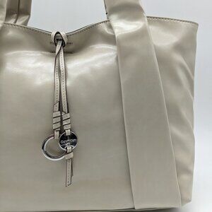 CALVIN KLEIN Hanna shiny faux-leather novelty tote shoulder bag -Pelican/Ivory
