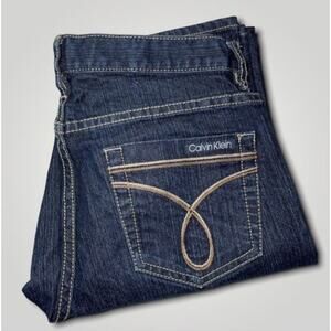 Iconic Calvin Klein jeans in a timeless dark blue wash. It is a versatile and classic piece for any wardrobe.