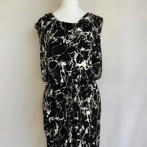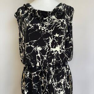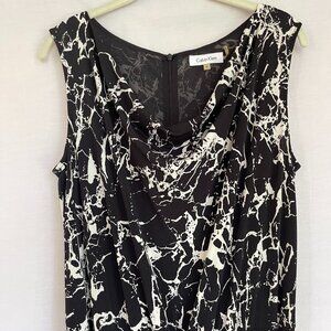 Featuring a black and white marbled print, sleeveless and with a scoop neck.