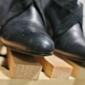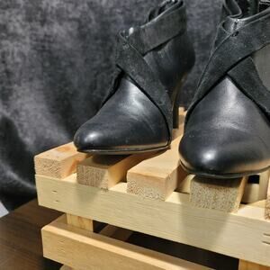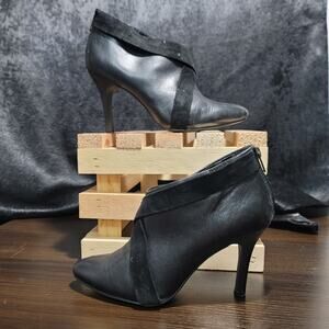 Style and Features: This bootie typically features a stiletto heel, often around 3-3/4 inches, and is crafted with a combination of smooth leather and suede leather in black.