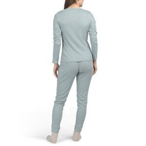 2 piece set includes top and matching pants, fabric provides stretch for ease of movement, embroidered brand logo accent, ribbed design, snap button front closure, elastic waist drawstring pants