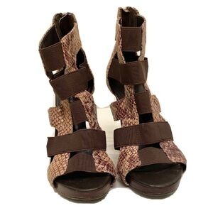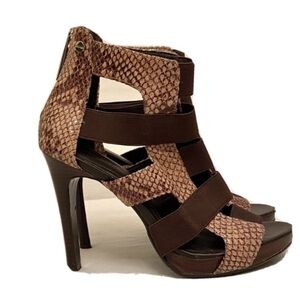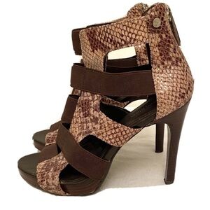 CALVIN KLEIN “Laurianna” Size 6 Faux Snakeskin High Heel Shoes, Cage, Back Zip, Faux Python, Animal Print. Condition is Pre-owned. Wear these pumps with any outfit and they will add class and style. Nice pre-owned condition with very light wear. Back zipper, stretchy bands, Calvin Klein zipper pulls and logo studs at the ankles.