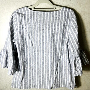 CALVIN KLEIN MEDIUM BOHO BEACH GREY WHITE STRIPPED BEACHY COASTAL INDIE BLOUSE. Grommet Closure with Intact Draw String at Neck Line.. 3/4 Bell Sleeve. Light Weight. Size Medium