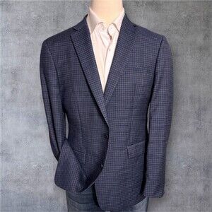 CALVIN KLEIN Mens Blazer 44R Sport Coat 2-Button Jacket Plaid Navy/Blue Wool