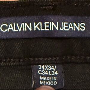Calvin Klein men's slim-fit jeans in tag size 34x34, featuring a sleek black denim material with some stretch for added comfort and flexibility. These jeans have a classic solid pattern, zip closure, and a mid-rise fit, making them suitable for all seasons. 5-pocket design. Calvin Klein branding. Made in Mexico, these jeans are machine washable and perfect for showcasing a modern American aesthetic.