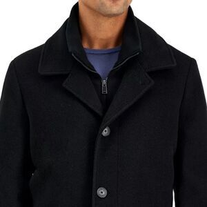 Fully lined and ready to fend off chilly-weather days, Calvin Klein's classic black overcoat is an outerwear essential that never goes out of style and always delivers on warmth.