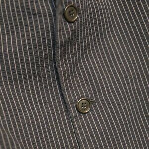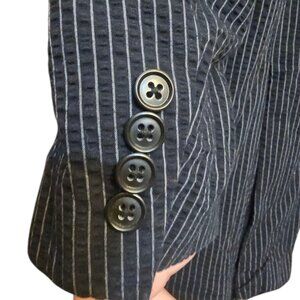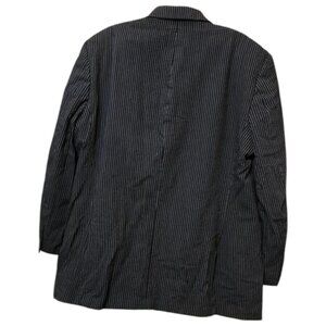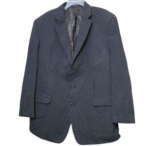 Men's casual blazer. Deep navy blue (almost black) with gray pinstripe, 3 front buttons & 2 back slits. Very good pre-owned condition.