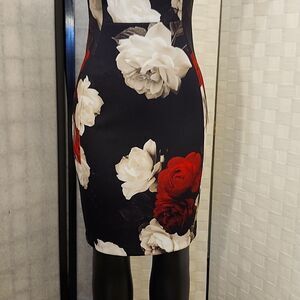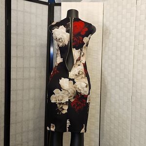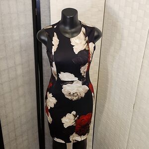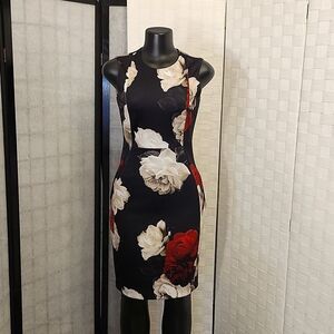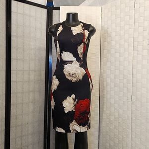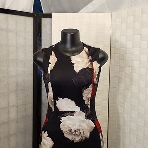 CALVIN KLEIN ROSE ROUND NECK BODYCON DRESS SIZE 2 COLOR WHITE &RED AND BLACK EXPOSED GOLD ZIPPER CLOSURE SLEEVELESS PASS THE KNEE LENGTH MADE WITH SHELL 92% POLYESTER 8%SPANDEX THIS ITEMS IS PRE-OWNED EXCELLENT CONDITION WITH ONLY LIGHT SIGNS OF WEAR IF ANY CHECK THE PICTURES