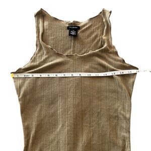 Keywords: tank top, sleeveless, ribbed, ruched, casual, everyday, basic, knit, beige, contemporary, minimalist, versatile, summer, spring