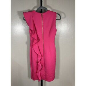 Dress to impress at your next formal event with this elegant hot pink bodycon dress from Calvin Klein. The knee-length dress features a crew neckline and a sleeveless design, making it perfect for a summer or spring party. The dress is made from a stretchy polyester material, ensuring a comfortable fit all night long.
