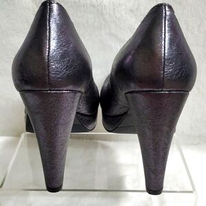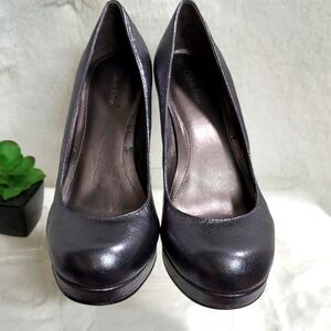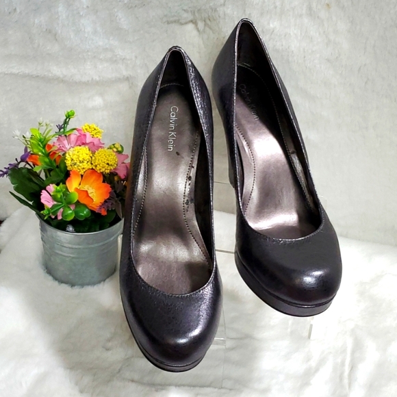 CALVIN KLEIN Scarlet Crinkle Metallic High Heel Pump - (Worn Once) These sexy pumps were bought to match my bridesmaid dress! Metallic iridescent crinkle cut leather, Graphite/Gunmetal in color, Chunky heel measures at 4" tall, with a front platform of 1". Beautiful Condition!