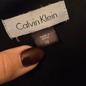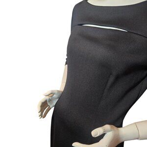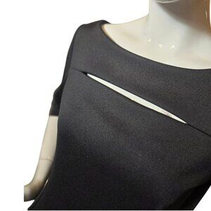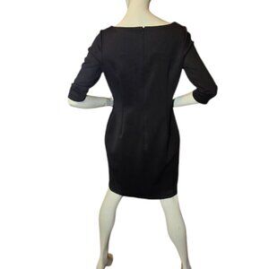 Classic black sheath dress by CALVIN KLEIN featuring princess seaming, scoop neckline, a cut out and 3/4 sleeves. 92% Polyester 8% Spandex. Excellent preowned condition. Perfect for the office, formal dinner, evening event...