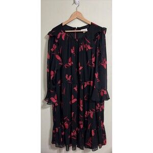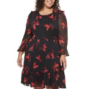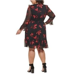 Calvin Klein. The dress is made of 100% polyester fabric with a floral pattern,