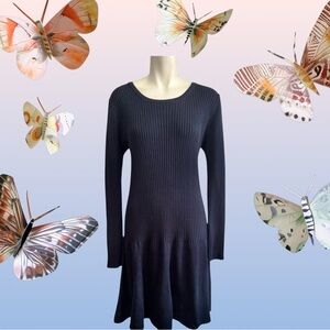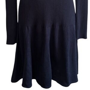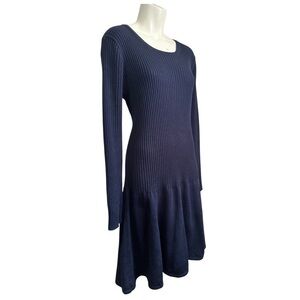 Simple and elegant Calvin Klein dark navy sweater dress. Office to date night styling. Top and sleeves are ribbed, flaring to a skirt at about the hips. Ribbed crew neck.