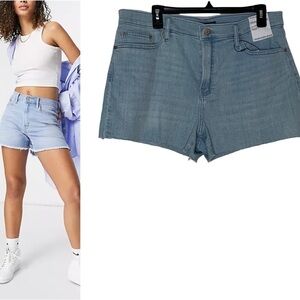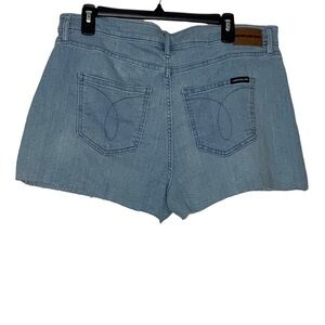 Calvin Klein light wash, high rise denim shorts. Zipper and button closure. 5 pocket design with loops. Raw hemline.