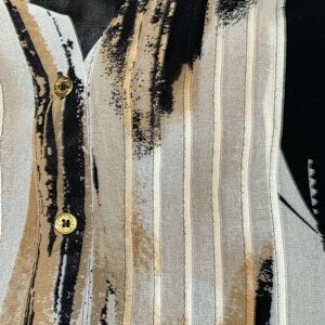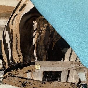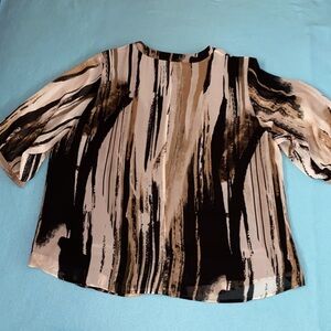 CALVIN KLEIN tunic blouse button front 3/4 sheer sleeves with gold button, pin tucked pleated at chest, art to wear, lined bodice, split v-neck, elegant style, flowy, oversized loose fit
